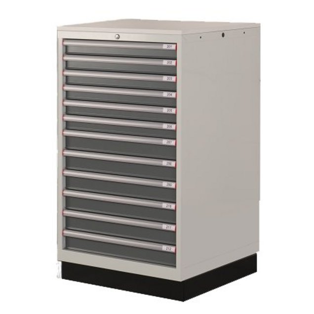 Der Toolbase® El-12 Professional schafft mit seinem großen Fassungsvermögen Übersicht und Ordnung. Die 12 Laden können auf Anfrage individuell konfiguriert und mit bis zu 200 kg pro Lade belastet werden. Hochwertige Materialien können in optional erhältlichen, einzeln verriegelbaren Klappen gelagert werden. Diese öffnen sich nur für Berechtigte.
